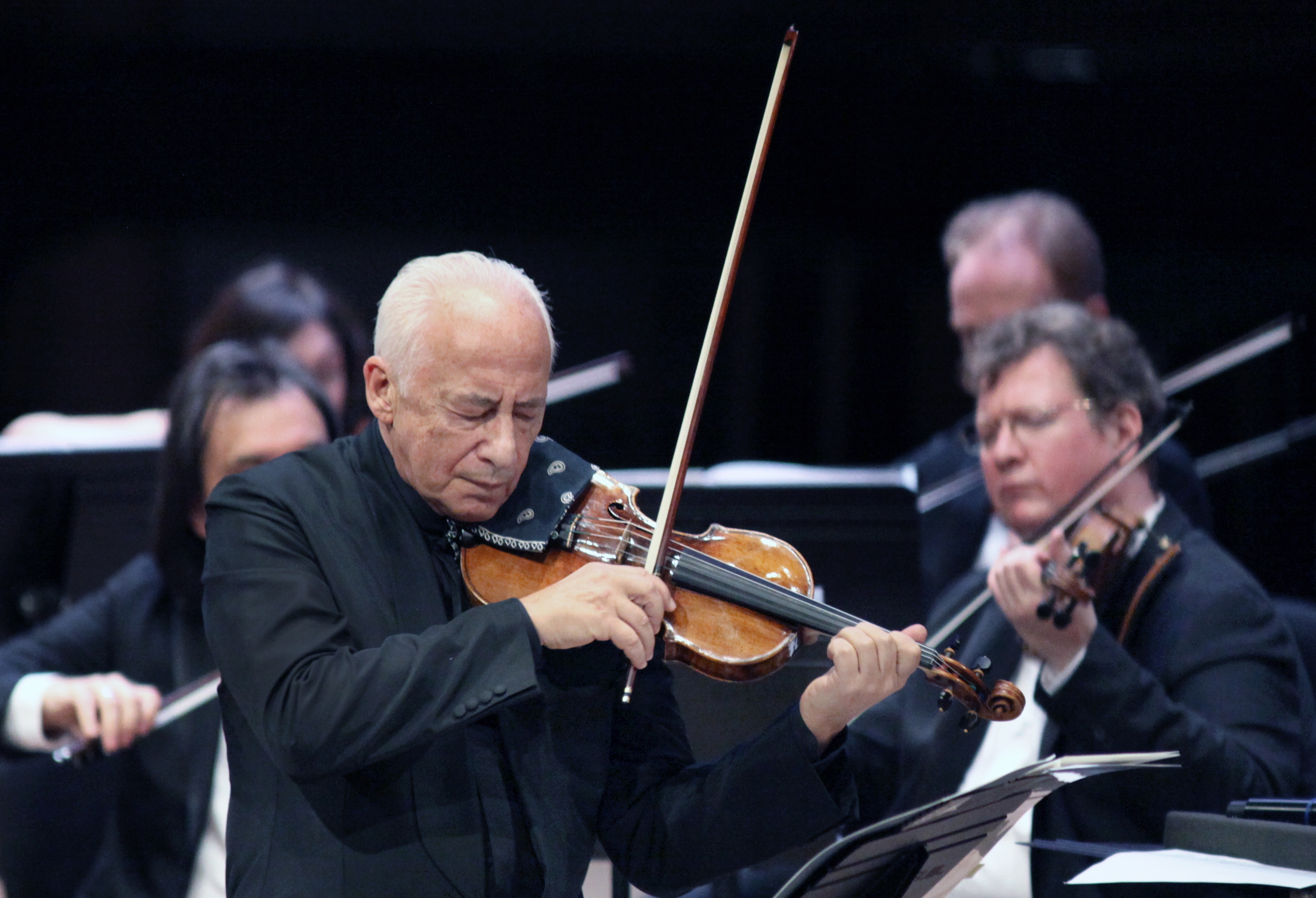 После полудня дождь поутих, но настоящее солнце взошло для любителей музыки вечером - по волшебству дирижерской палочки. В филармонии состоялся концерт Государственного камерного оркестра "Виртуозы Москвы" под управлением народного артиста СССР Владимира Спивакова. Маэстро, как всегда, не только управлял оркестром, но и сам блестяще играл на скрипке.