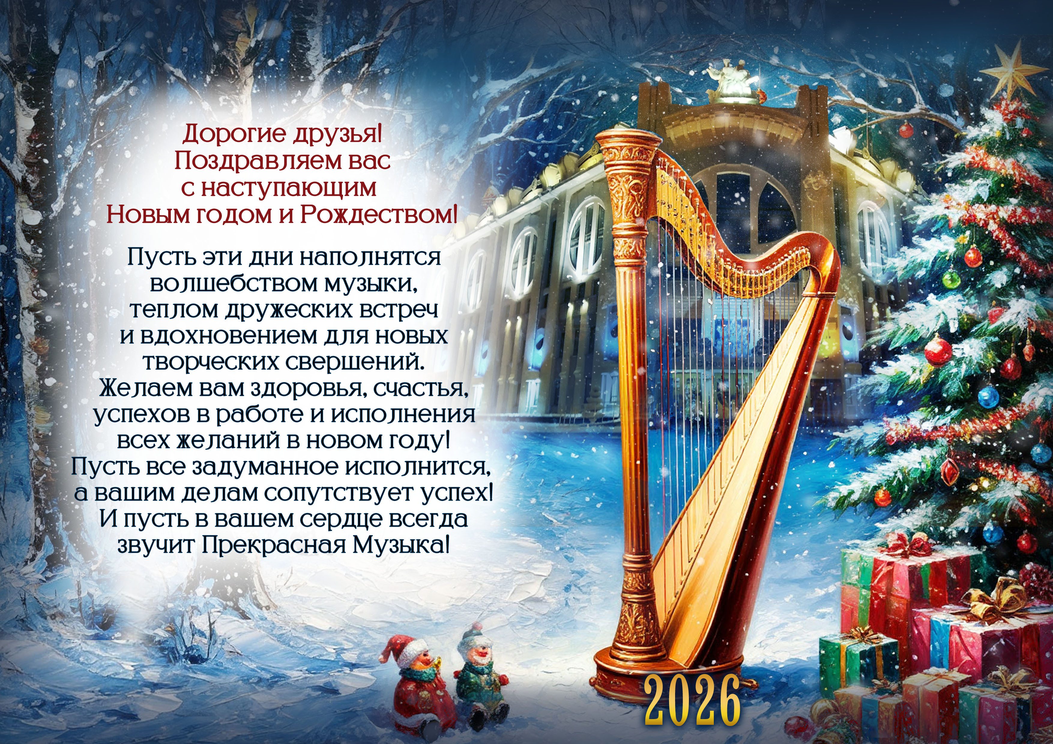 Пусть предстоящий 2026 год подарит вам незабываемые встречи, яркие впечатления, новые возможности и важные открытия. Каждый день нового года пусть станет красивой и яркой страницей счастливой жизни! Пусть ваши близкие будут здоровы и счастливы, а ваши дома всегда будут наполнены любовью, теплом и благополучием.
