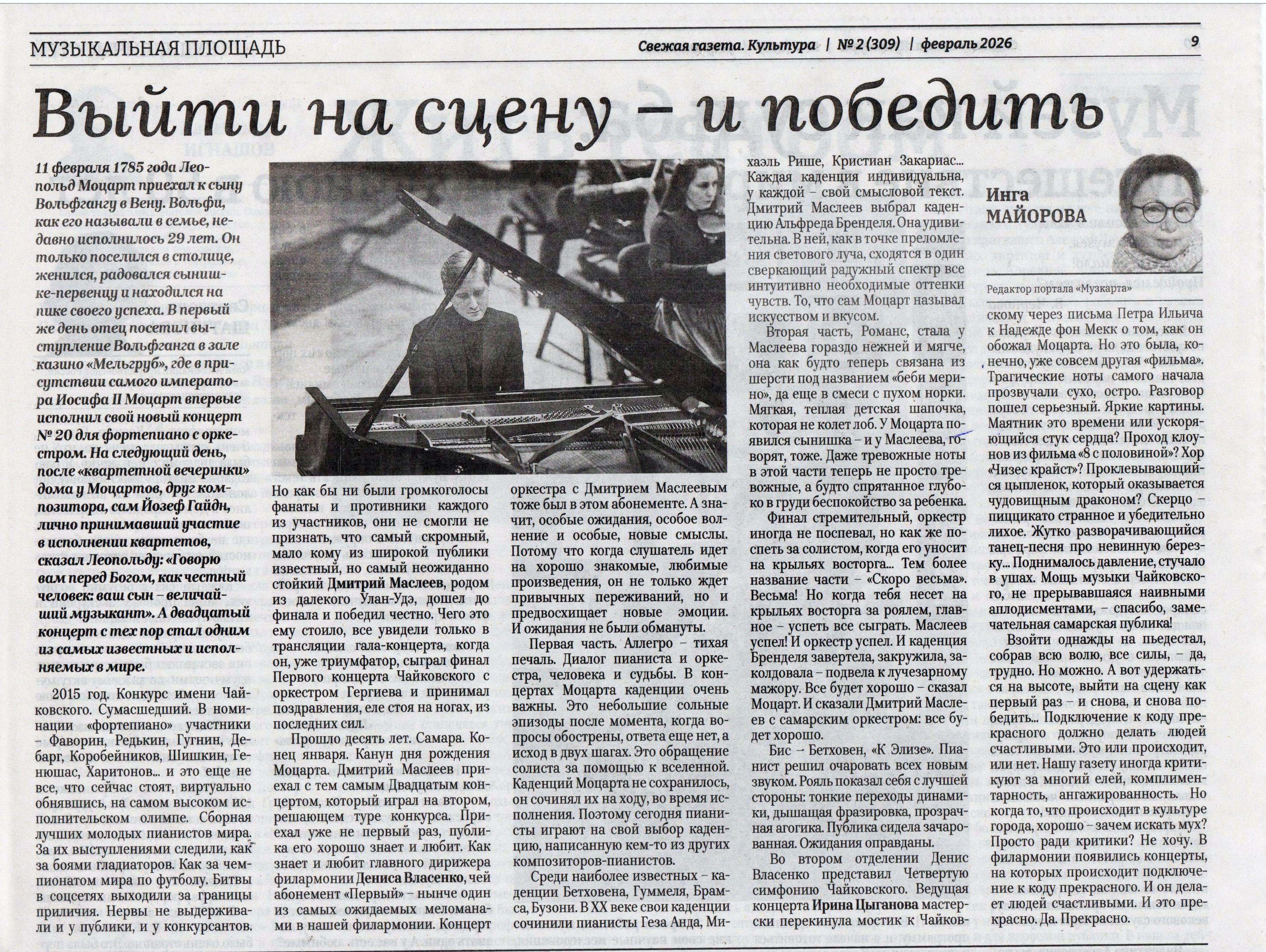 Прошло десять лет. Самара. Конец января. Канун дня рождения Моцарта. Дмитрий Маслеев приехал с тем самым двадцатым концертом, который играл на втором, решающем туре конкурса. Приехал уже не первый раз, публика его хорошо знает и любит. Как знает и любит главного дирижера филармонии Дениса Власенко, чей абонемент «Первый» - нынче один из самых ожидаемых меломанами в нашей филармонии. Концерт оркестра с Дмитрием Маслеевым тоже был в этом абонементе. А значит, особые ожидания, особое волнение и особые, новые смыслы. Потому что когда слушатель идет на хорошо знакомые, любимые произведения, он ждет не только привычных переживаний, но и предвосхищает новые эмоции. И ожидания не были обмануты.